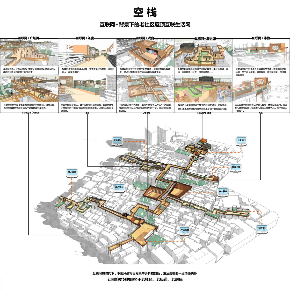 我们将空中的公共社区脱离开原有建筑一段距离,将结构落于建筑的缝隙,让建筑有一个可以呼吸采光的空间。同时依随肌理用栈道将空中社区串联,形成儿童互联游戏区,老人网络服务区、舞蹈运动活动区、互联戏台区、云端体检站、实体开心农场区在内的六大功能组成。由此由空中的社区栈道串联出了一个社区的公共活动与娱乐系统。